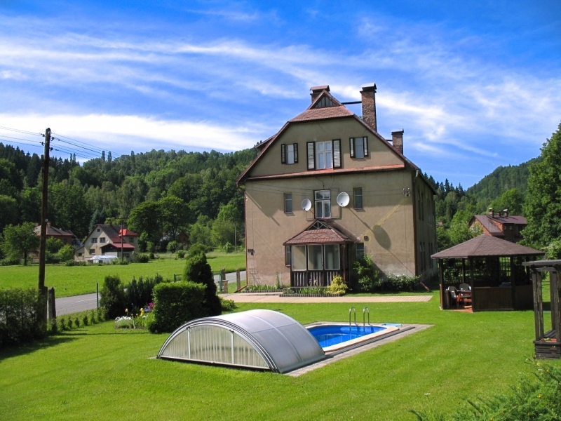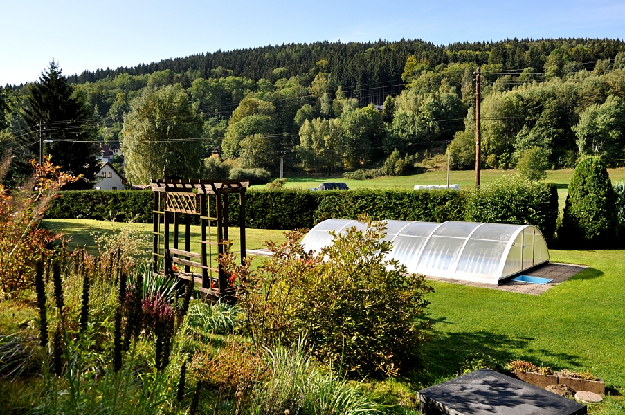 Dobře zařízená polovina rodinného domu se zapuštěným bazénem, lehátky, pěkným altánem a zahradním krbem situovaná na okraji obce Dolní Štěpanice.
