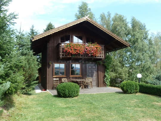 Nově postavená dřevem obložená a velmi pěkně zařízená chata situovaná ve svahu velké zahrady. Z chaty je krásný výhled na panorama města a příhraniční hory Bor a Hejšovinu.