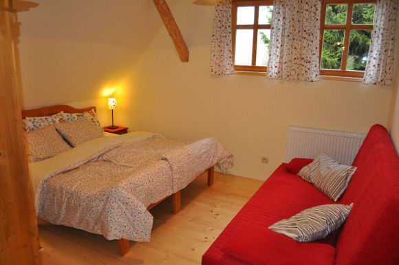 V ložnici v podkroví (21 m2) jsou uváděná dvě jednolůžka, což je jedno lůžko vysunuté z druhého, tedy 2 lůžka u sebe o nestejné úrovni.