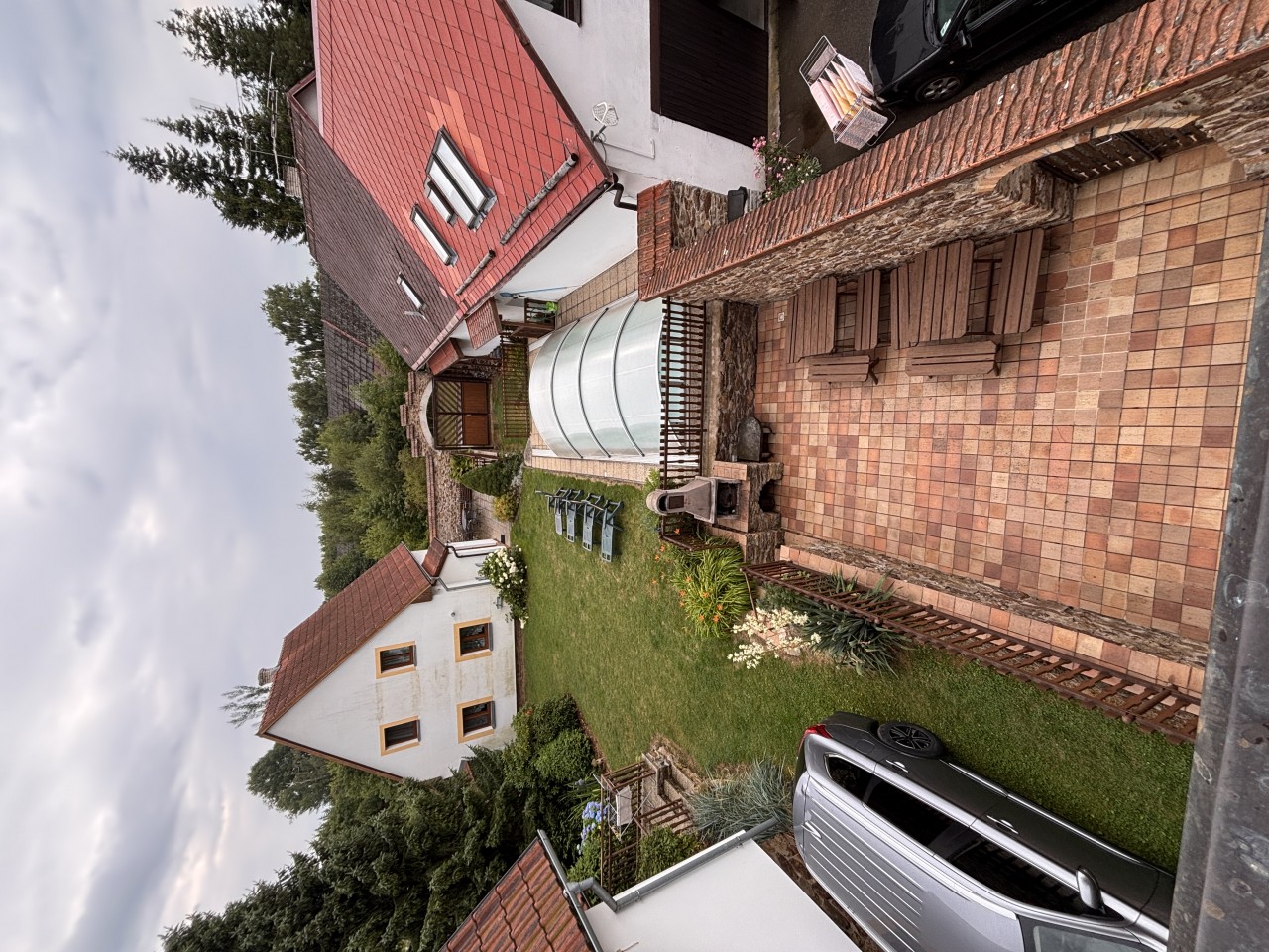Na zahradě stojí dva stejné "prázdninové domky" i uvnitř stejně vybavené, každý na opačné straně zahrady, vzdálené cca 15 metrů od sebe. Každý má svoji terasu. Bazén a zahradní gril jsou společné.