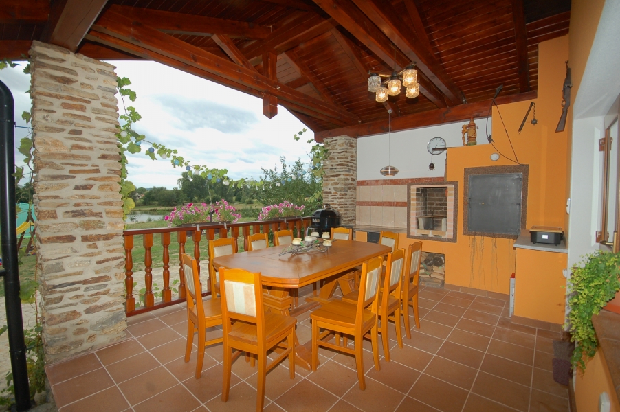 Nový, moderně zařízený prázdninový domek s vinárnou a terasou s posezením u kamen. Klidné místo na okraji obce s výhledem na zahradu s dětským hřištěm, dětským domečkem (možnost spaní, TV, lednice, mrazicí box) a sportovním rybníkem. Sportovní rybáři budou nadšeni z trofejních úlovků vč. dravých ryb. V přilehlém domku je veškeré zařízení pro zpracování ryb. V okolí jsou lesy bohaté na houby a lesní plody. Rovinatý terén vhodný pro nenáročnou cykloturistiku. Rybník s čistou vodou je vhodný ke koupání i k projížďkám na pramičce.