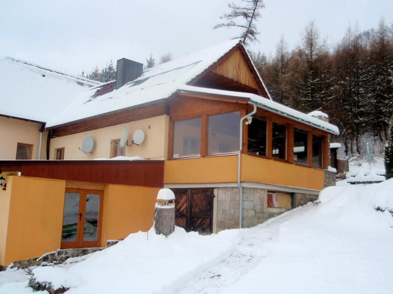 Terasa je prosklenná s posezením a krbem. Dětský koutek. Vířivka pro 6 osob.