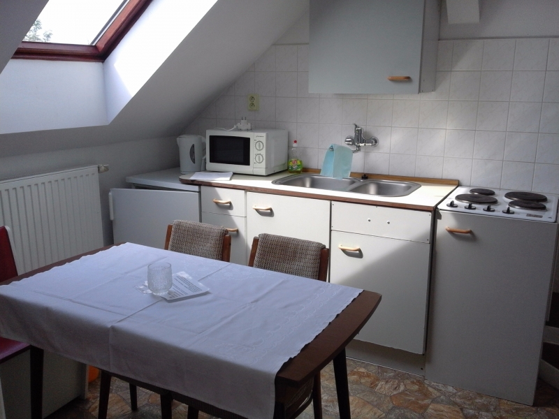 | Kuchyň (5 m2, počet míst u jídelního stolu: 6, jídelní kout, místnost je průchozí) |